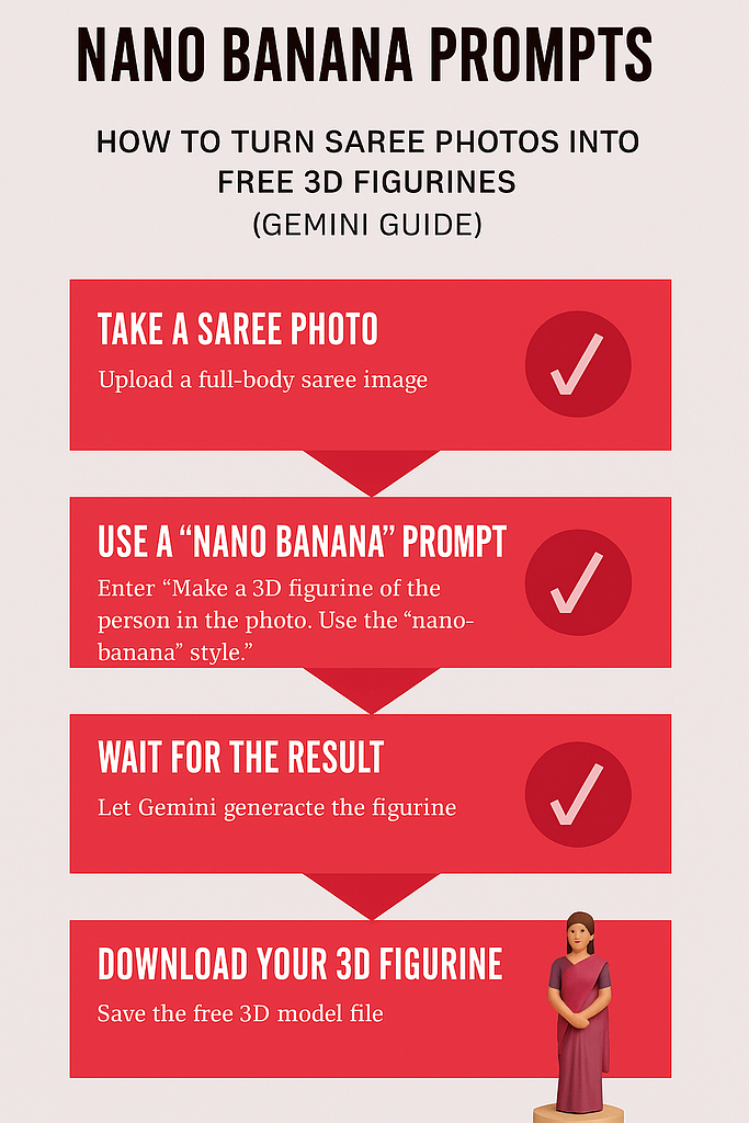 AI has collapsed the barrier between flat images and dimensional creativity. With nano banana prompts and Google Gemini, turning saree photos into free 3D figurine-style renders is not just possible it’s practical, fast, and scalable.