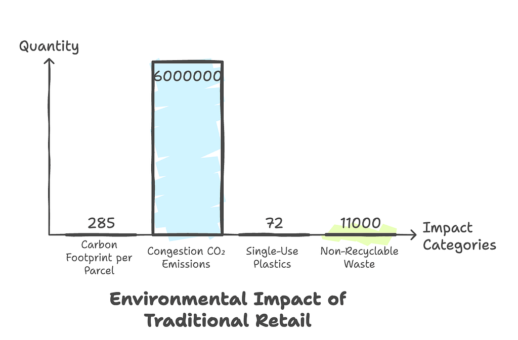 Each quick commerce parcel generates 285g of CO₂, with transport responsible for 51% of emissions. Fast deliveries contribute to 6 million tonnes of additional CO₂ from traffic congestion. - Vehicle Impact: