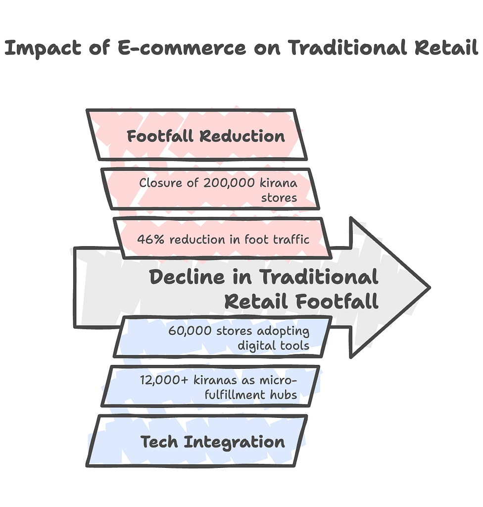 - Metro areas see a 4–6% annual decline in footfall, leading to about 200,000 kirana closures since 2022.